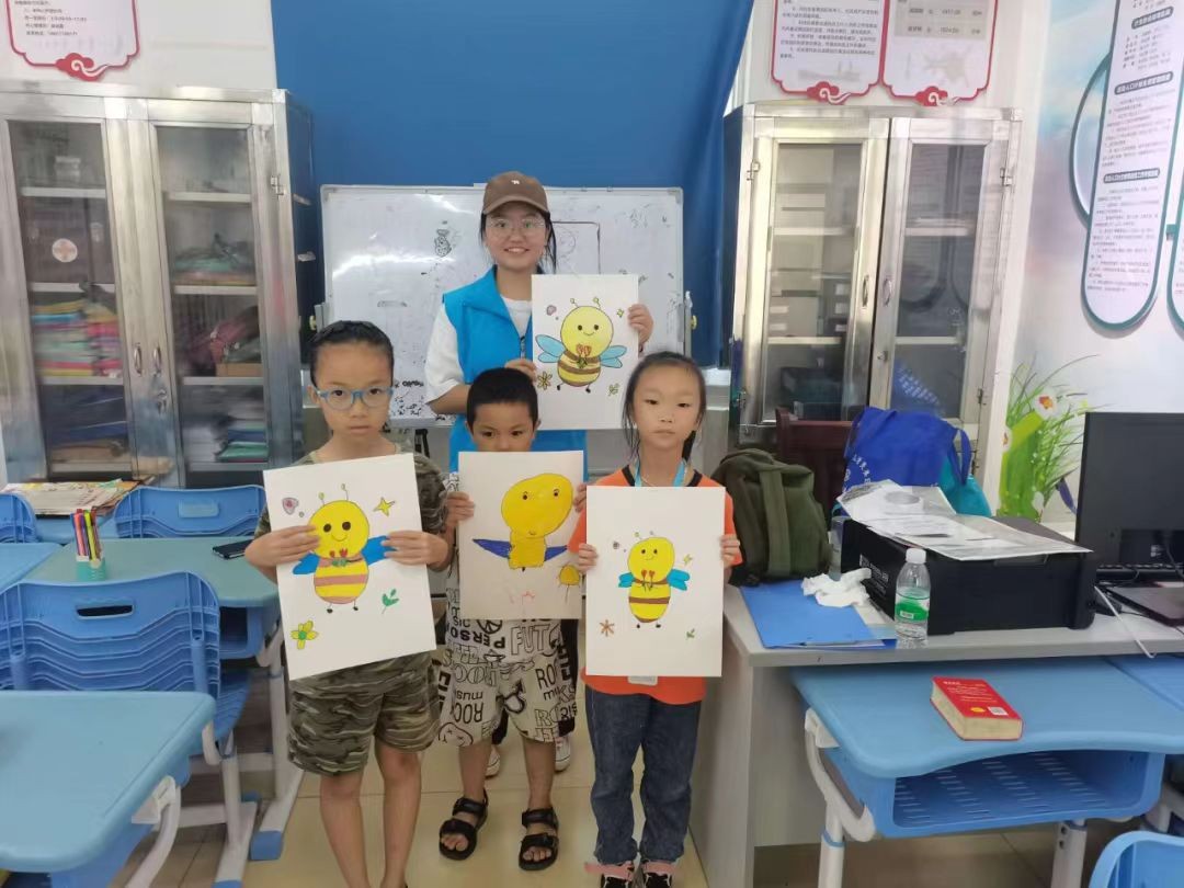再来看看桥北社区的孩子们,等待他们的是一只小蜜蜂。志愿者们耐心地向他们教授绘画技巧,用铅笔一遍遍勾勒出蜜蜂的雏形。很快,活灵活现的小蜜蜂在小朋友们的绘笔下出现啦!通过这次活动,孩子们也明白了要像小蜜蜂一样勤劳,懂劳动,去劳动。